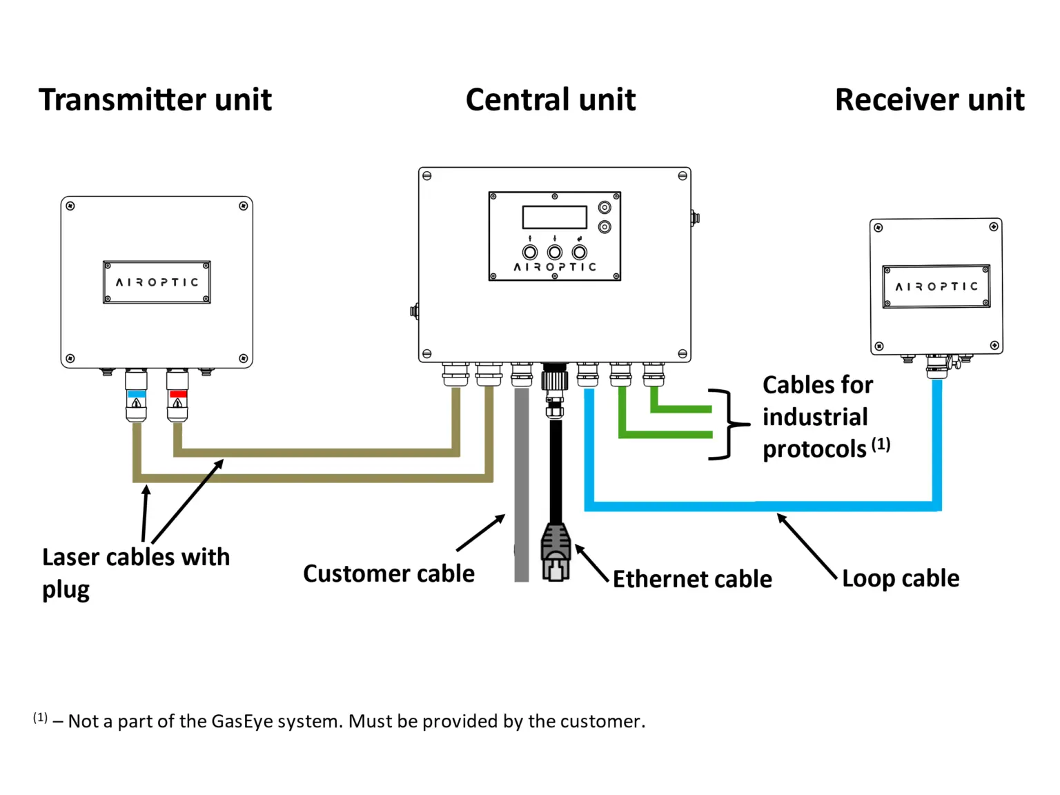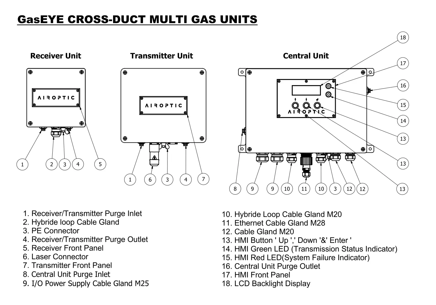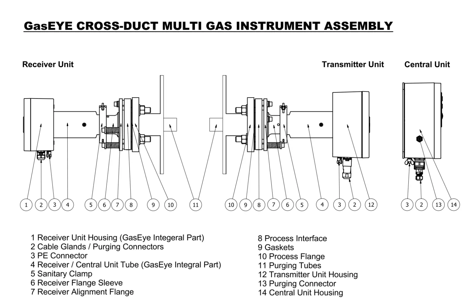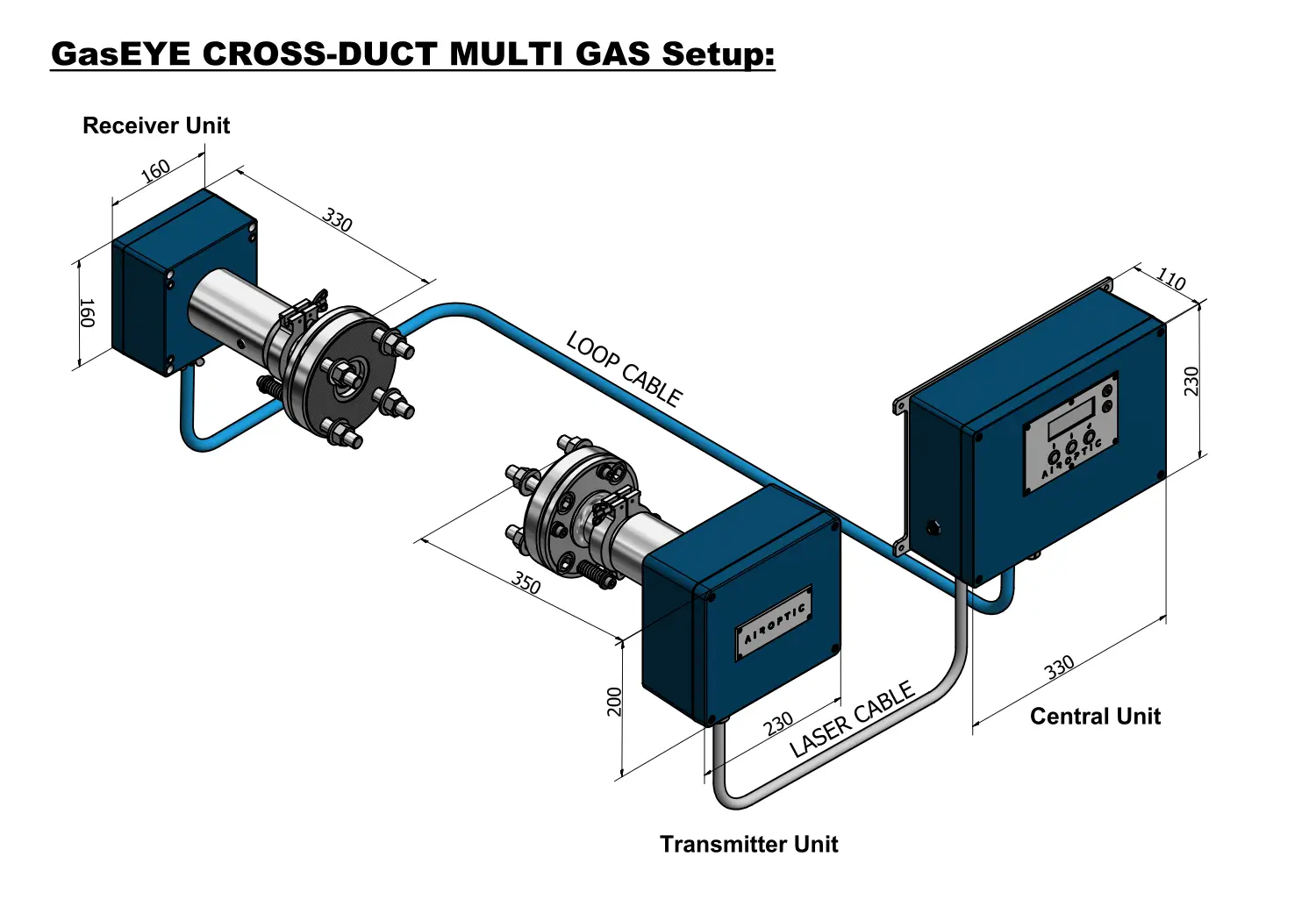 The GasEye Cross Duct can measure the desired gas components very selectively. It may happen that the absorption line of the measured gas is influenced by the presence of other gases. This influence is compensated by the full shape of the detected signal curve analysis and applying algorithms that correct the discrepancies accordingly. MG (Multi Gauge) The GasEye Cross Duct MG (Multi Gauge) analyzer consists of a pair of cross-duct sensors – a transmitter and a receiver unit as well as a central unit. The transmitter unit emits laser radiation directly through the process containing the constituents of interest. The receiver unit collects the radiation on the other side of the process duct. The central unit, located close to the transmitter unit (< 2 meters) contains analyzer electronics, MMI and I/O. The receiver unit is connected to the central unit by means of a hybrid loop cable (included) and the transmitter unit is connected to the central unit by one or two electrical cables (included).